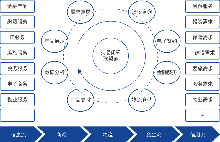中国人a片协同交易平台通过整合大型金控集团内外部资源,实现中国人a片客户的协同交易,最终构建可信产业链,通过平台将中国人a片交易线上化、标准化、透明化,实现信息流、商流、物流、资金流、信用流“五流”合一。