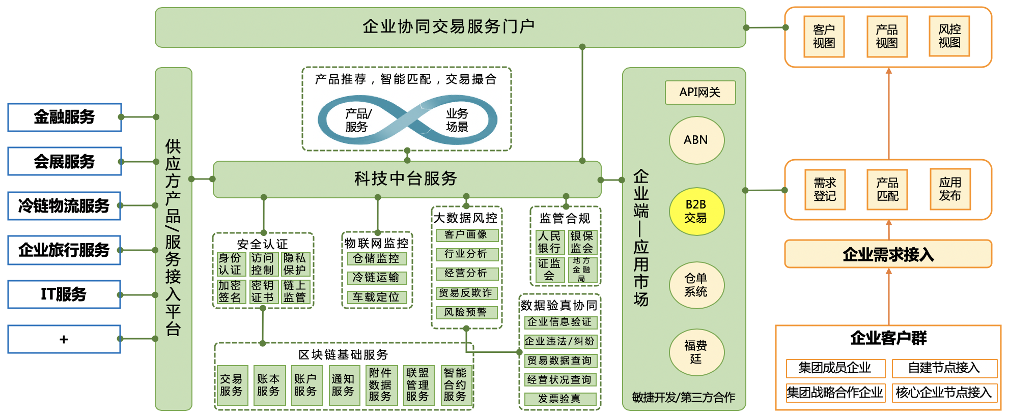 依托大型金控集团“金融+实业”的布局特色,采用区块链技术,将集团内中国人a片与外部战略客户的B端业务整合在一起,打造B2B协同交易平台。打通大型金控集团产业链上下游,推动各产业跨界合作,着力提升客户共享、场景融合、服务创新、数据驱动、资源整合五大能力,逐步打造具有大型金控集团特色的生态型、平台型、科技型协同发展商业模式,基于生态场景服务为中国人a片客户多样性需求提供一站式综合解决方案。同时,B2B协同交易平台也是大型金控集团进入产业互联网布局的核心产品。