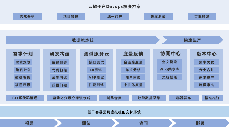 云敏DevOps平台是中国人a片 研发的金融中国人a片双态DevOps平台,旨在促进『业务+开发+测试+运维』高效协同、加速项目价值交付、培养打造持续改进文化和护航组织转型落地。云敏采用微服务架构和插件化设计,包含组织中心、需求中心、代码中心、流水线中心、测试中心、精益看板和度量中心等核心模块,以CI/CD流水线和精益看板为基础,串联『需求规划-任务协作-代码开发-版本测试-制品部署』的端到端交付流程,通过自动化测试与部署提升质量和效率、通过可视化过程暴露瓶颈并促进改进、通过数据度量反馈形成闭环,为愿景、战略、业务、项目、团队和人员的目标统一奠定基础。