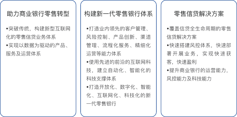 对于业务能力,技术能力相对较弱的商业银行,提供从业务、技术及信贷平台解决方案等全方位,成体系的建设商业银行零售信贷业务体系支持。