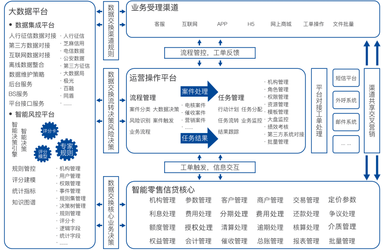 智慧零售信贷平台是解决商业银行在零售转型过程中,应对信贷业务领域面临的困难与挑战,建立的一整套基于互联网架构,充分运用大数据、人工智能、生物识别、云计算等技术搭建的先进的、智能的整套零售信贷业务平台。平台涵盖了零售信贷业务的贷前、贷中、贷后全生命周期管理,是以客户为中心、以数据为基础、以决策为驱动,注重精细化集中运营管理的全自动化、全流程化、全数字化的智慧零售信贷解决方案。